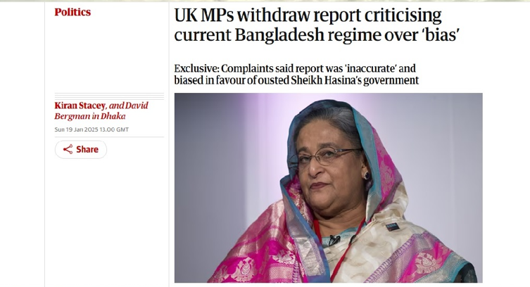 বাংলাদেশে ড. মুহাম্মদ ইউনূসের নেতৃত্বাধীন অন্তর্বর্তী সরকারের সমালোচনা করে যুক্তরাজ্যের একদল এমপির প্রকাশিত প্রতিবেদনটি প্রত্যাহার করা হয়েছে। ব্রিটিশ সংবাদমাধ্যম দ্য গার্ডিয়ান জানিয়েছে, ওই প্রতিবেদনে সাবেক প্রধানমন্ত্রী শেখ হাসিনার সরকারকে সমর্থন দেওয়ার অভিযোগ উঠলে এটি প্রত্যাহার করা হয়।