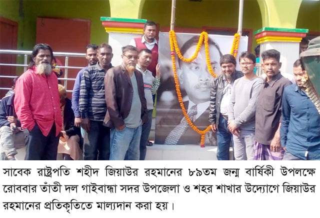 সাবেক রাষ্ট্রপতি শহীদ জিয়াউর রহমানের ৮৯তম জন্ম বার্ষিকী উপলক্ষে রোববার গাইবান্ধা জেলা বিএনপির উদ্যোগে বিভিন্ন কর্মসূচী পালন করা হয়।