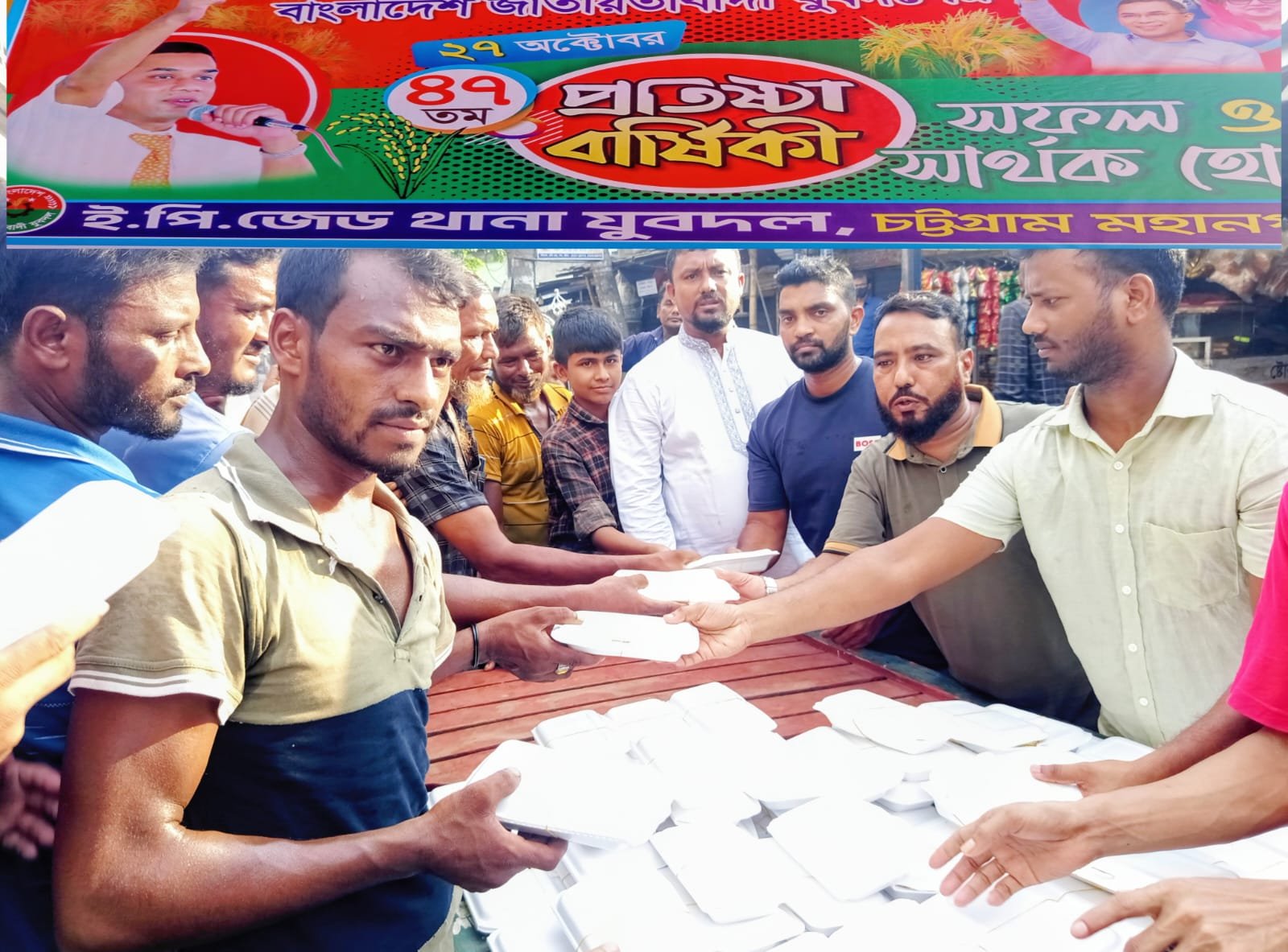 বাংলাদেশ জাতীয়তাবাদী যুবদলের ৪৭তম প্রতিষ্ঠাবার্ষিকী উপলক্ষে চট্টগ্রাম নগরীর ইপিজেড থানাধীন ৩৯নং ওয়ার্ড এলাকায় দুস্থ ও অসহায় মানুষের মাঝে খাবার বিতরণ, আলোচনা সভা ও দোয়া মাহফিল অনুষ্ঠিত হয়েছে।