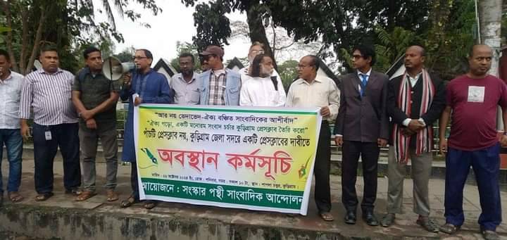 কুড়িগ্রাম জেলা শহর থেকে প্রকাশিত সাপ্তাহিক ধরলার দেশ পত্রিকার সম্পাদক ও প্রকাশক আমানুর রহমান খোকনের সভাপতিত্বে কুড়িগ্রামে পাঁচটি নয় একটি প্রেসক্লাব চাই দাবিতে ২৬ অক্টোবর শনিবার সকালে জেলা শহরের শাপলা মোড়ে সাংবাদিকদের অবস্থান কর্মসূচি অনুষ্ঠিত হয়েছে ।
