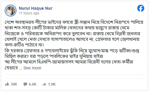 স্ট্যাটাসে নুর লেখেন, “দেশে থাকা আওয়ামী লীগের ভাইদের বলব— স্ত্রী-সন্তান নিয়ে বিদেশে নিরাপদে থাকা শত শত কোটি টাকার মালিক নেতাদের কথায় বিভ্রান্ত হয়ে রাস্তায় নেমে নিজের ও পরিবারের নিরাপত্তা ঝুঁকিতে ফেলবেন না। রাস্তায় নেমে বিপ্লবী জনতার হাতে ধরা পড়লে নেতা হাসপাতালে দেখতে আসবে না, জেলে গেলে কলা-রুটিও পাঠাবে না। মুখোশ পরে গুপ্ত মিছিল করার দরকার নেই— ধরা পড়লে জনগণের ধোলাই কিন্তু ভয়াবহ হবে।”