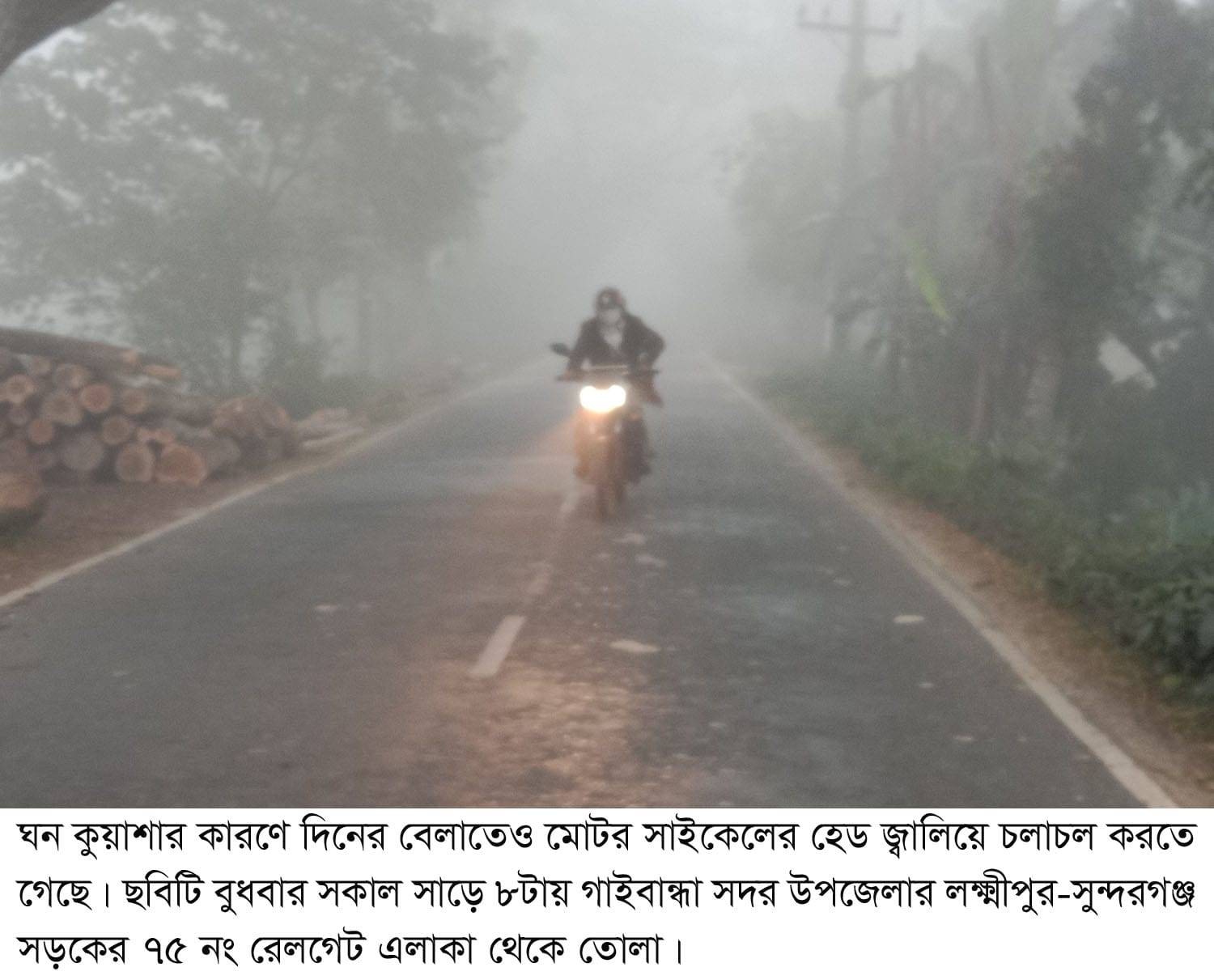 তীব্র শীত আর ঘন কুয়াশায় গাইবান্ধার জনজীবন বিপর্যস্ত হয়ে পড়েছে। প্রচন্ড ঠান্ডার কারণে বিভিন্ন রোগে আক্রান্ত হয়ে হাসপাতালগুলোতে বাড়ছে রোগীদের সংখ্যা। বুধবার দুপুর দিকে সূর্যের মুখ দেখা গেলেও তাতে কোনো উত্তাপ ছিল না। ঘন কুয়াশার কারণে ঘন কুয়াশার কারণে ব্রহ্মপুত্র-যমুনাসহ অন্য নদ-নদীতে নৌযান চলাচল বিঘ্নিত হচ্ছে।