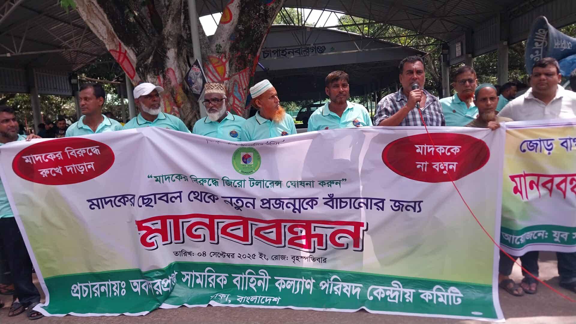 চাঁপাইনবাবগঞ্জ পৌর এলাকার চাঁন্দলাই জোড়বাগান বস্তি অঞ্চলে মাদক বিক্রি ও সেবনের বিরুদ্ধে প্রতিবাদ জানিয়ে মানববন্ধন করেছে এলাকাবাসী। বৃহস্পতিবার সকাল সাড়ে ১০টায় জেলা প্রশাসকের কার্যালয়ের সামনে এ মানববন্ধন অনুষ্ঠিত হয়।