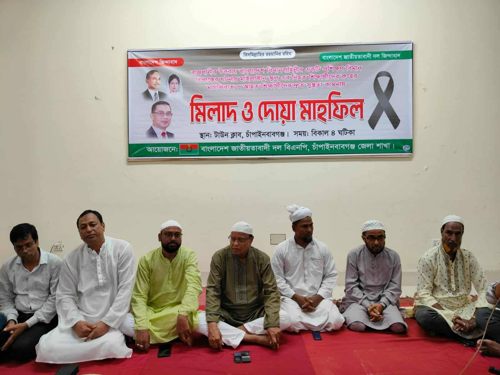 মাহফিলে নিহত শিক্ষার্থীদের বিদেহী আত্মার মাগফিরাত ও তাদের পরিবারের প্রতি সমবেদনা জানানো হয় এবং আহতদের সুস্থতার জন্য দোয়া করা হয়। দোয়া মাহফিলে চাঁপাইনবাবগঞ্জ জেলা বিএনপি, পৌর বিএনপি এবং অঙ্গসংগঠনের নেতাকর্মীরা অংশ নেন।