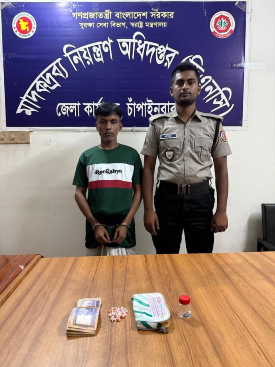ডিএনসির এক প্রেসনোটে জানানো হয়, গোপন সংবাদের ভিত্তিতে শনিবার (২৪ মে) রাত আট টার দিকে চাঁপাইনবাবগঞ্জ পৌর এলাকার রেলষ্টেশন প্রান্তিক পাড়ায় মাদকদ্রব্য নিয়ন্ত্রণ অধিদপ্তর চাঁপাইনবাবগঞ্জ জেলা কার্যালয়ের সদস্যরা অভিযান চালায়। এসময় ইয়াবাসহ মাদক ব্যবসায়ী হাসান তারেক ওরফে পাতানের দেহতল্লাশী করে ইয়াবা ট্যাবলেট-৫০পিস এবং নগদ অর্থ ৪০ হাজার ৫০০ টাকাসহ আটক করা হয়।