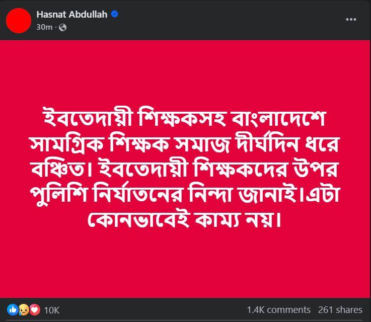 হাসনাত আবদুল্লাহ লিখেছেন, “ইবতেদায়ি শিক্ষকসহ সারাদেশের শিক্ষক সমাজ দীর্ঘদিন ধরে বঞ্চনার শিকার। ইবতেদায়ি শিক্ষকদের ওপর পুলিশি নির্যাতন কোনোভাবেই গ্রহণযোগ্য নয়। আমি এই হামলার তীব্র নিন্দা জানাই।”