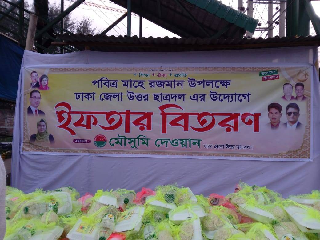 পবিত্র মাহে রমজান উপলক্ষে ঢাকা জেলা উত্তর ছাত্রদলের উদ্যোগে ইফতার বিতরণ অনুষ্ঠিত হয়েছে। এ উদ্যোগের মাধ্যমে পথচারী শিশু, দরিদ্র মানুষ, মাঠকর্মী, গার্মেন্টস কর্মী, অটোচালক, সিএনজি ও রিকশাচালক এবং যাত্রীদের মাঝে ইফতার বিতরণ করা হয়।