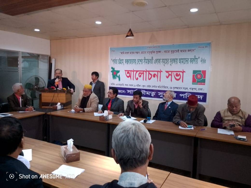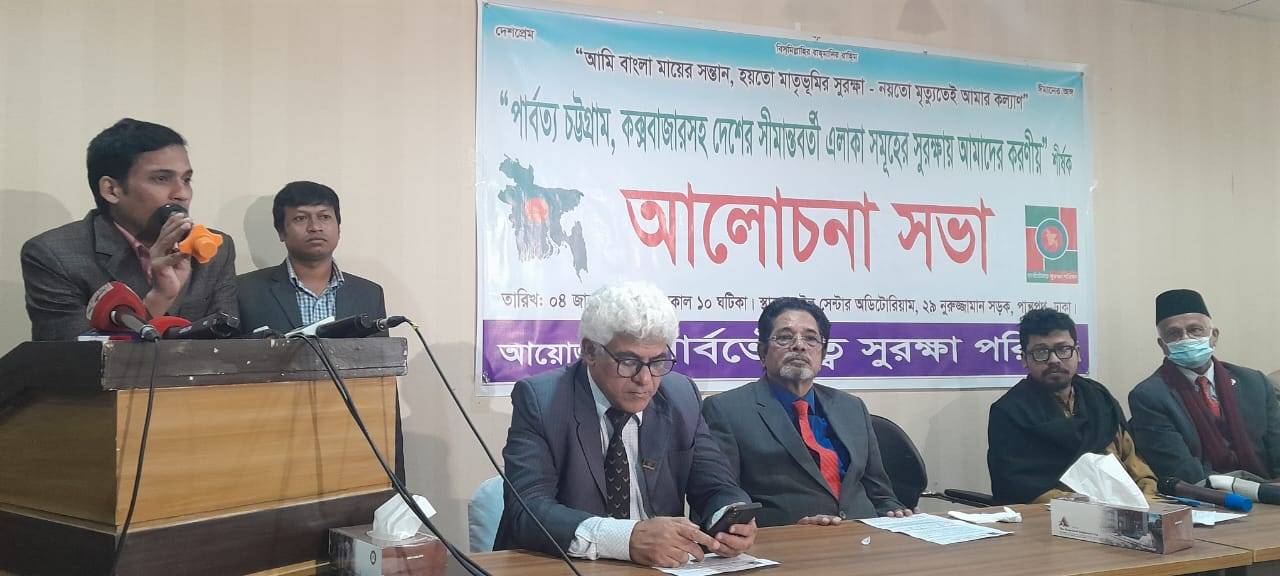 শনিবার রাজধানীর পান্থপথ সেল সেন্টার মিলনায়তনে "সার্বভৌমত্ব সুরক্ষা পরিষদ" এর আয়োজনে পার্বত্য চট্টগ্রাম ও কক্সবাজারসহ দেশের সীমান্তবর্তী এলাকা সমূহের নিরাপত্তা বৃদ্ধি দাবিতে আলোচনা সভা অনুষ্ঠিত হয়।