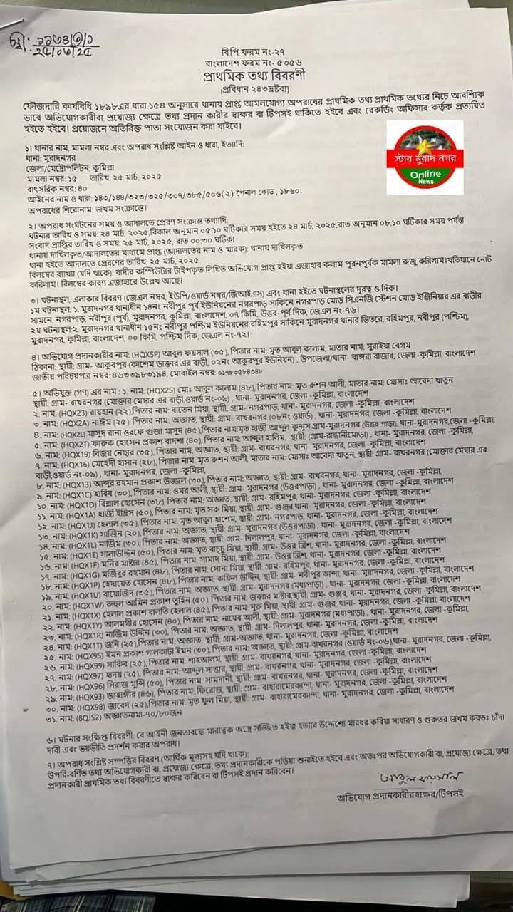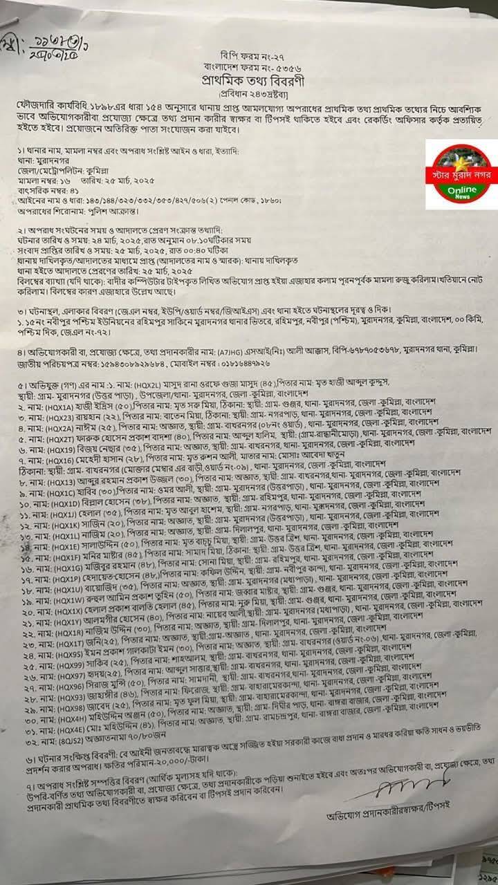 কুমিল্রার মুরাদনগর থানায় হামলা এবং এবং সিএনজি থেকে চাঁদা না পেয়ে বৈষম্য বিরোধী ছাত্র আন্দোলনের সমন্বয়কদেরকে মারপিটের অভিযোগে স্থানীয় বিএনপি নেতাকর্মীদের বিরুদ্ধে পৃথকভাবে দুটি মামলা হয়েছে। ইতিমধ্যে ৬ জনকে গ্রেপ্তার করেছে পুলিশ।