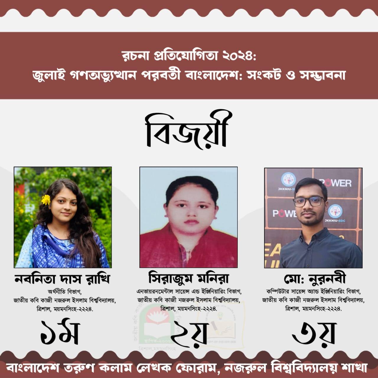 বাংলাদেশ তরুণ কলাম লেখক ফোরাম, জাতীয় কবি কাজী নজরুল ইসলাম বিশ্ববিদ্যালয় শাখার আয়োজনে অনুষ্ঠিত "জুলাই গণঅভ্যুত্থান পরবর্তী বাংলাদেশ: সংকট ও সম্ভাবনা" বিষয়ক রচনা প্রতিযোগিতায় বিজয়ীদের নাম ঘোষণা করা হয়েছে।