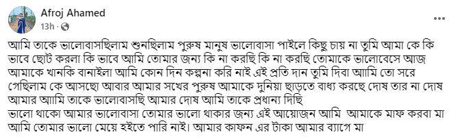 পটুয়াখালী সদর উপজেলার কাঠপট্টি এলাকায় এক তরুণী ফেসবুকে একটি আবেগঘন পোস্ট করার পর আত্মহত্যা করেছেন। বুধবার (২৪ অক্টোবর) দুপুরে এই মর্মান্তিক ঘটনাটি ঘটে।