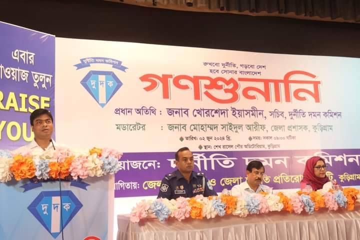 আজ ০২ জুন ২০২৪, রবিবার দূর্নীতি দমন কমিশনের মাননীয় সচিব জনাব খোরশেদা ইয়াসমীন মহোদয় কুড়িগ্রাম জেলা প্রশাসন ও জেলা দূর্নীতি প্রতিরোধ কমিটির সহোযোগিতায় দূর্নীতি দমন কমিশনের আয়োজনে ১৬৬ তম গণশুনানিতে প্রধান অতিথি হিসেবে উপস্থিত ছিলেন।