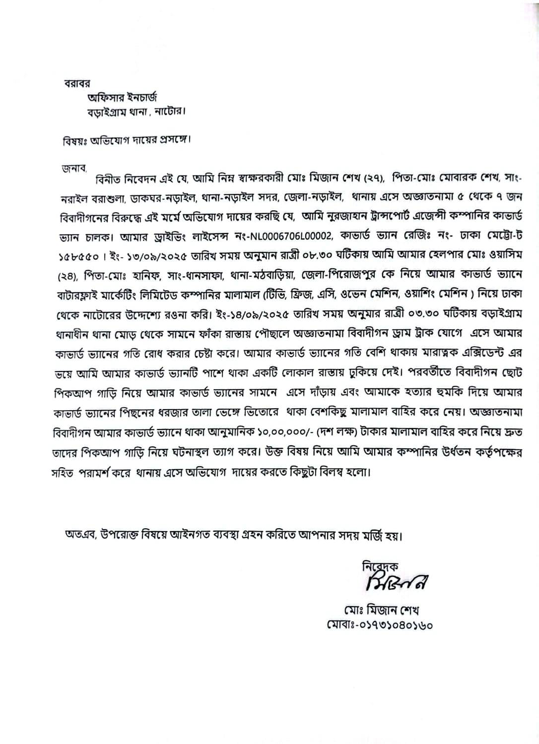 অভিযোগ সূত্রে জানা যায়, ভুক্তভোগী চালক মো. মিজান শেখ (২৭), পিতা মো. মোবারক শেখ, নড়াইল সদর উপজেলার বরাশুলা গ্রামের বাসিন্দা। তিনি নুরজাহান ট্রান্সপোর্ট এজেন্সির কাভার্ড ভ্যানচালক। ভ্যানটির রেজিস্ট্রেশন নম্বর ঢাকা মেট্রো-ট ১৫৮৫৫০।