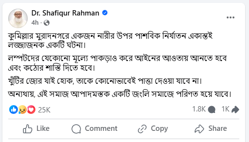 ফেসবুক পোস্টে জামায়াত আমির লিখেন, “মুরাদনগরে একজন নারীকে ঘরে ঢুকে যেভাবে পাশবিক নির্যাতন চালানো হয়েছে, তা অত্যন্ত লজ্জাজনক ও সভ্য সমাজে অকল্পনীয়। লম্পটদের যেকোনো মূল্যে আইনের আওতায় আনতে হবে এবং দৃষ্টান্তমূলক শাস্তি নিশ্চিত করতে হবে। খুঁটির জোর থাকুক বা না থাকুক, কোনো অপরাধীকে ছাড় দেওয়া যাবে না। তা না হলে সমাজ এক সময় পুরোপুরি জংলি সমাজে রূপ নেবে।”